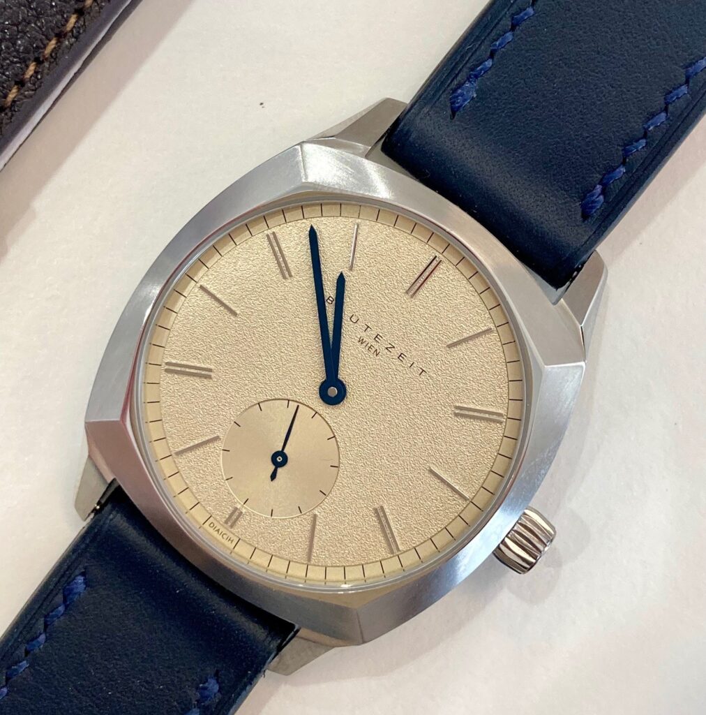 The Blütezeit Wien is a three-hand watch with a special twist: a small seconds subdial at 6 o’clock that adds a touch of classic elegance. The heat-blued baton hands are deliberately understated, enhancing the watch’s timeless charm.