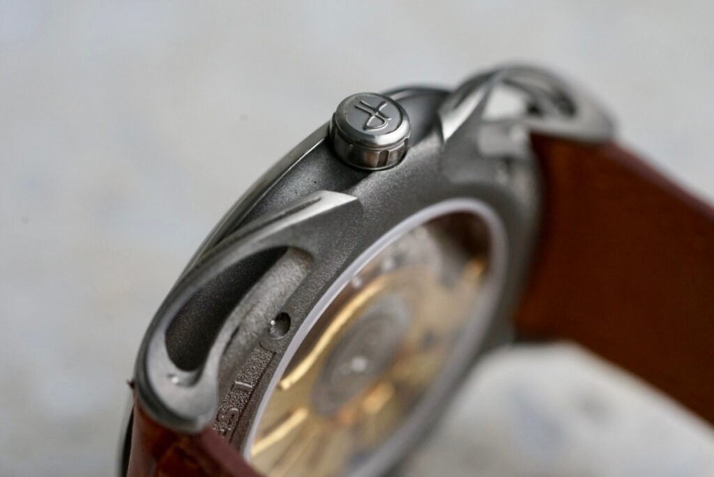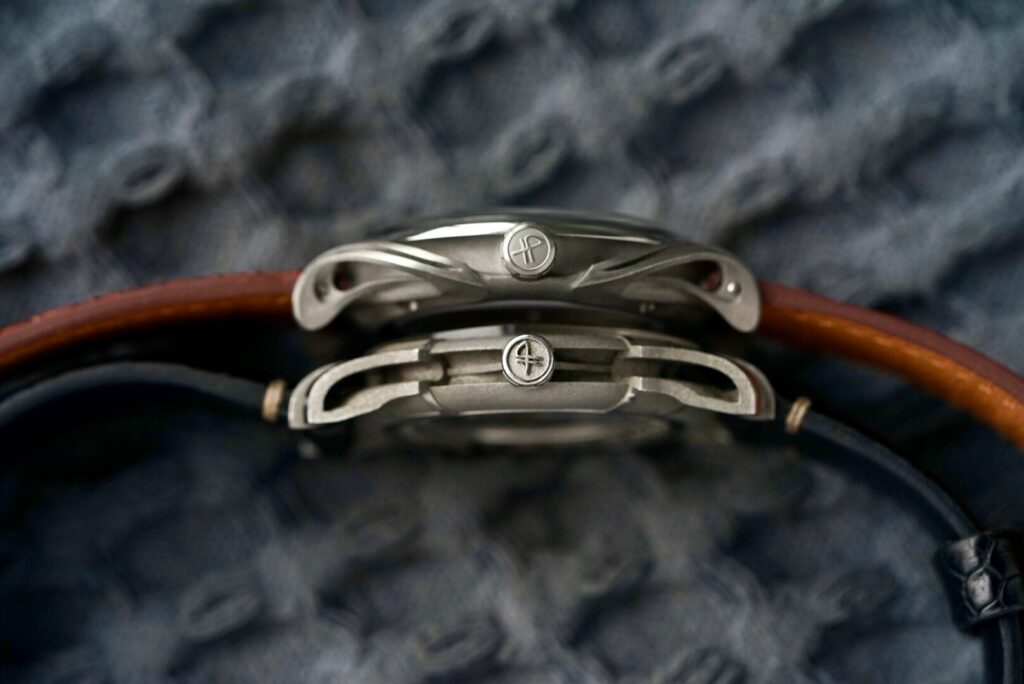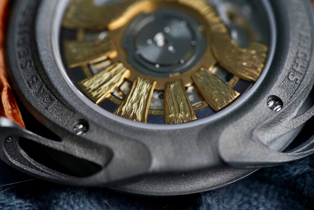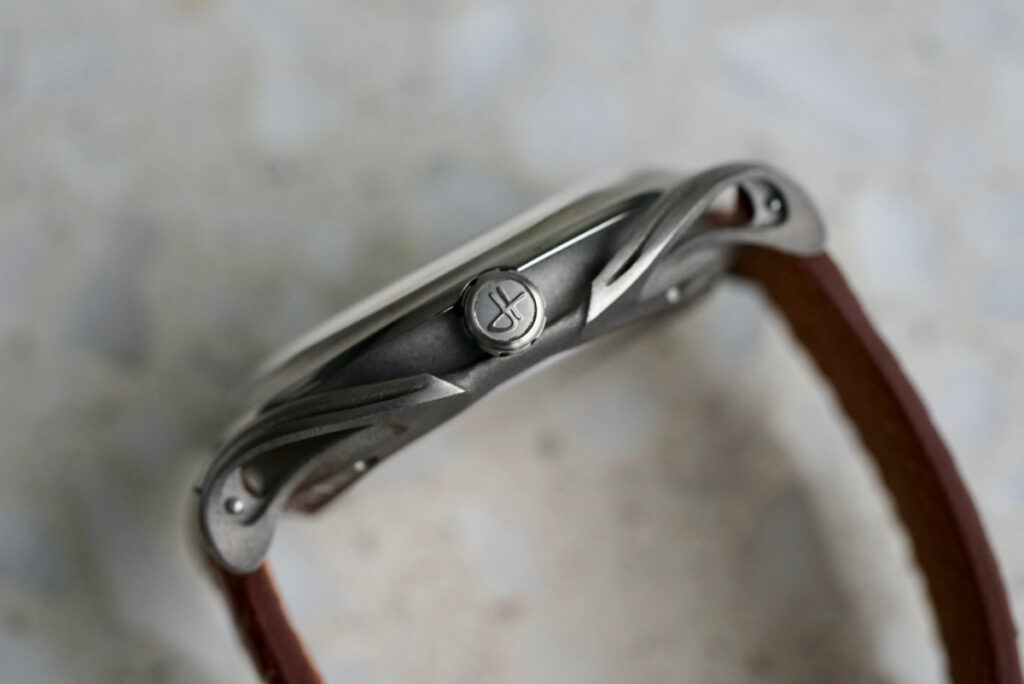 With watches below a certain price point, brands tend to have to compromise somewhere, and as a result, you might often hear that it is the dial or the case or the hands that are the main draw. But with the LAB 1, almost every element pulls you in. The titanium case has flowing, hollowed-out lugs that seem to emerge impossibly from the caseback—ethereal, almost organic, like the roots of a tree or something drawn from nature and reimagined in metal. They call to mind vintage bombe or flame lugs but taken several steps further. It took me a few days to really wrap my head around how they sit on the wrist—they almost seem detached from the case when viewed at the right angle.