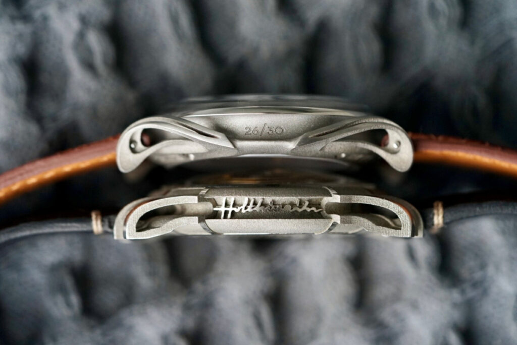 The concave bezel combines linear and circular brushing with a polished edge where the midcase begins, and as is typical of the brand, parts of the case are left raw to showcase the unique textures left behind by the 3D printing process.
