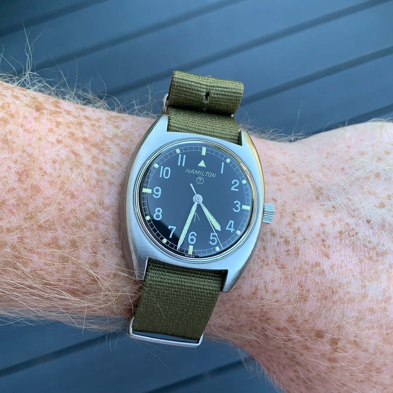 I love the watch, it shows its age and patina which gives it that old school charm and feel. I like its genuine British army history, no nonsense function and styling. The dial and hands have tritium lume that now glows softly and beautifully dull showing its age. It has fixed spring bars, as of the MOD specification and contract, so throw it on a nato of your choice and you’re ready to go.
