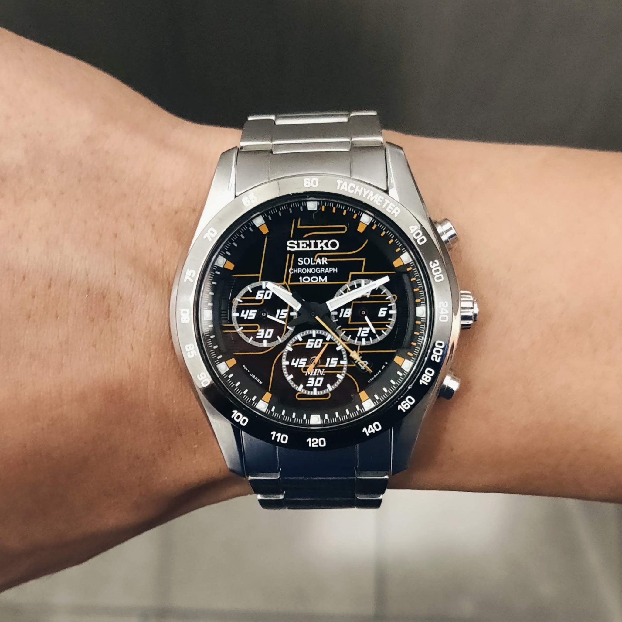 I purchased this Seiko Solar Criteria Chronograph SSC067 8 years ago. It was an expensive watch for me at the time and my first Seiko. I couldn’t find the model number. It uses a V175 caliber – a solar chronograph with date at 4 o’clock. The case number is 0an0, measures 42mm, lug width 22mm, 100m water resist, a screw-down caseback, covered by a sapphire crystal. The crown isn’t screw-down, but has a solid snap in and out.