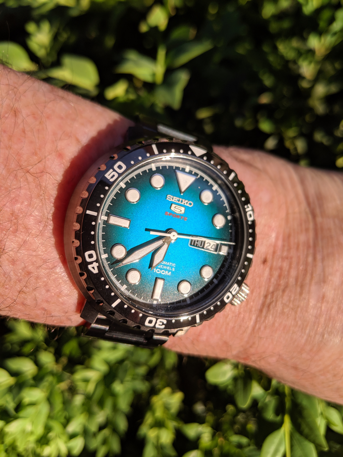 Monster, Turtle, Tuna, Sumo, Samurai, Shogun, Arnie…there’s no end to the list of nicknames watch collectors give Seiko watches. Add to this the Seiko Bottlecap, a watch series launched in 2018 in various executions. The nickname derives from the watch’s obvious physical similarities with a bottlecap, such as its chunky case and notched bezel. The one I’ve got is the SRPC65K1. This has a black PVD case and bracelet and a brilliant blue-green (perhaps teal) gradient dial. I’ve had mine about a year and although I’ve bought many other watches since then, the SRPC65K still gets plenty of wrist time.